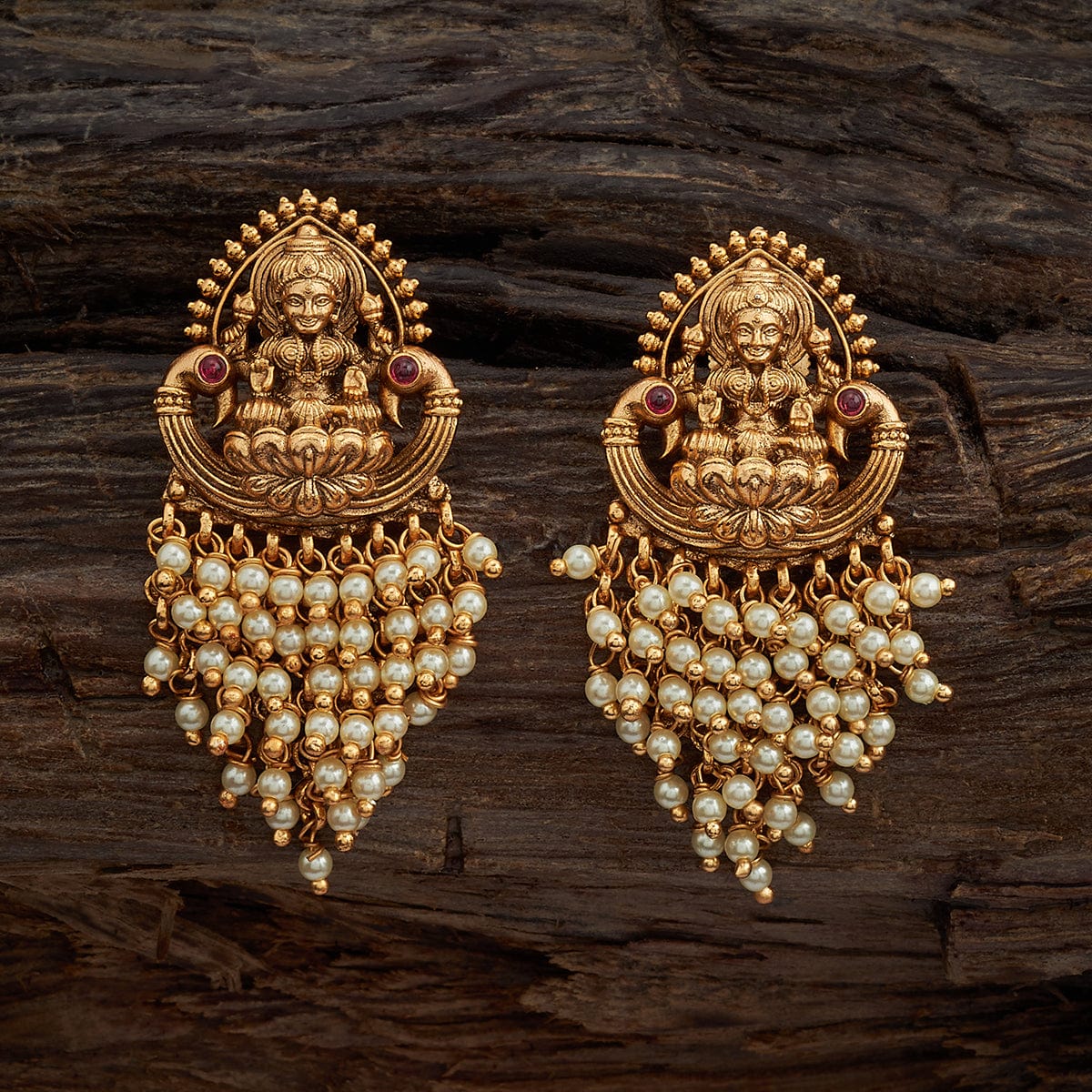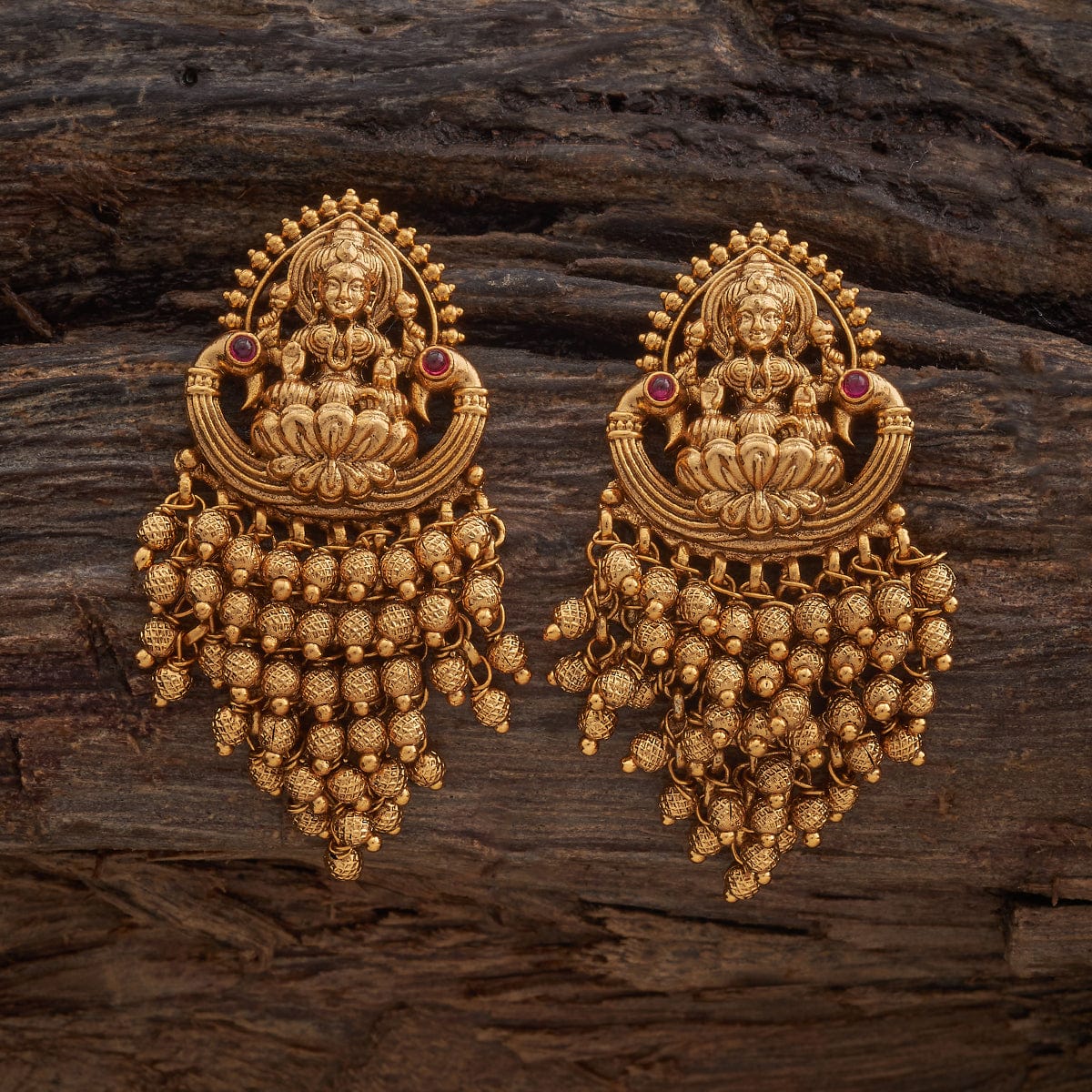 Heavenly Goddess motifs are one of the evergreen motifs in the fashion world, as they offer a royal and confident look to the wearer, which is why our latest pair of antique earrings offers dazzling motifs studded with ruby stones. The gold polish on the heavenly Goddess and peacock motifs is the main source of glamour for these hanging earrings.