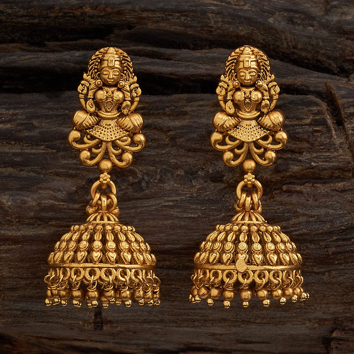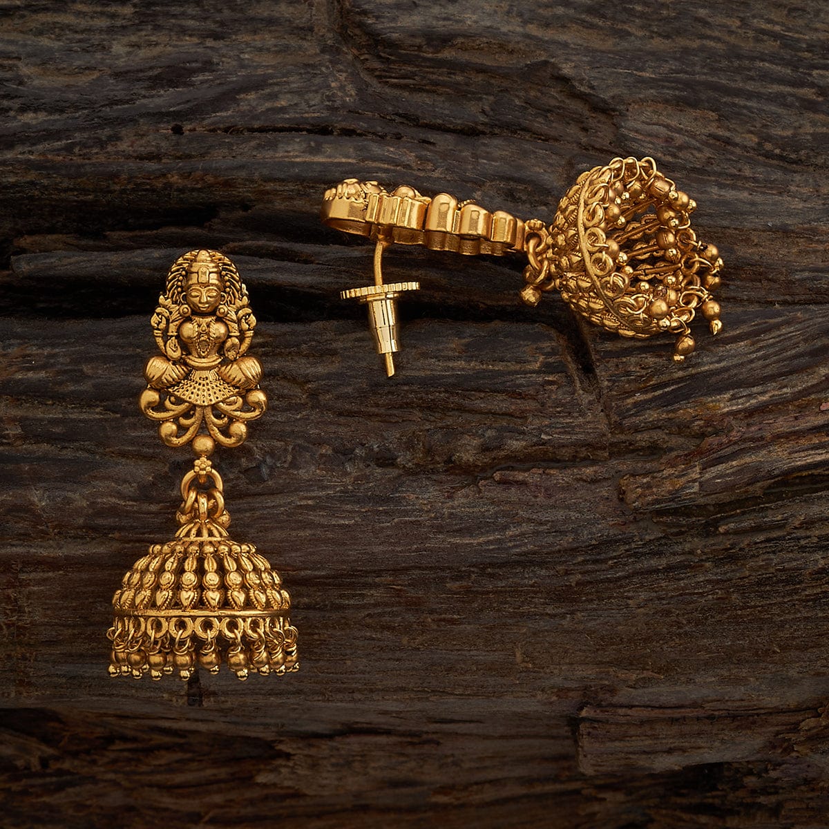 Showcase your love for royal and heavenly motifs with our latest pair of antique earrings. These charming Jhumkas will be the perfect complementing accessory to all of your outfits, thanks to their eye-catching Goddess motifs adorned with shining gold polish. All you have to do is wear these earrings with matching accessories to get your desired look this wedding season.