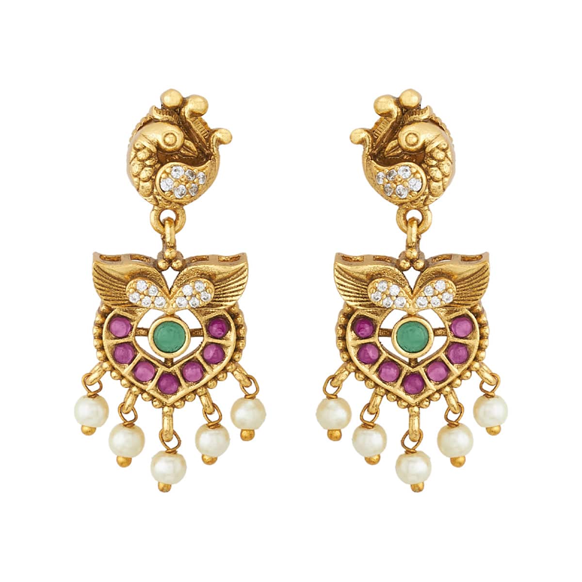 Leaf Design Antique EarringIntroducing our breathtaking antique earrings, designed to steal the spotlight wherever you go! Crafted with a copper alloy base metal, these earrings boast a remarkable peacock design that exudes elegance and charm. Adorned with synthetic stones and beads, the hanging-style earring adds a touch of glamour to your outfit.