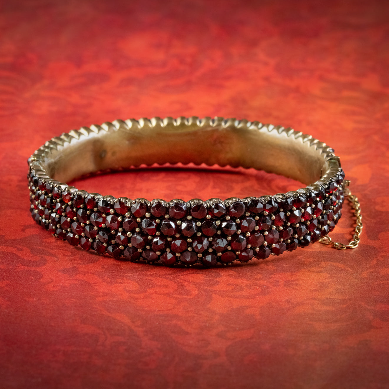The band is made of mixed metal, or ¡°Garnet Gold¡± and held securely around the wrist with a box clasp and safety chain at the side. It¡¯s in excellent condition and boasts a fabulous array of Garnets.