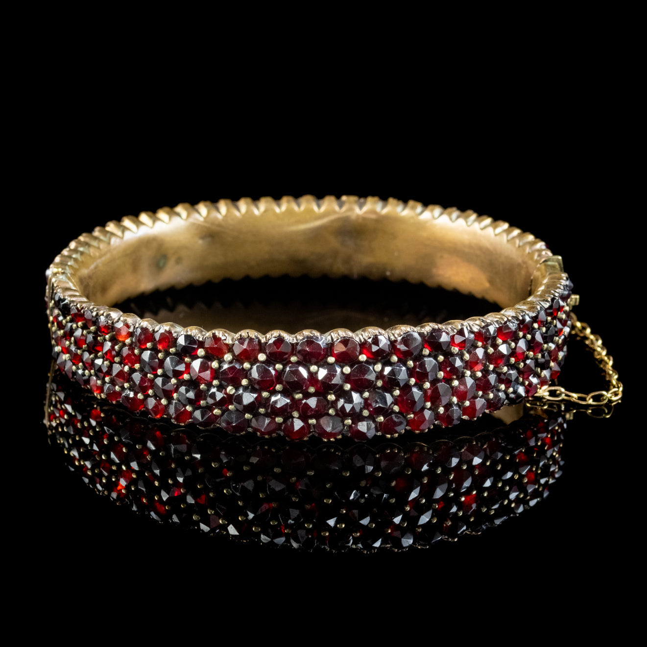 An exquisite Antique Victorian Bohemian Garnet bangle from the late 19th Century. The piece is pave set with four rows of glistening rose cut Bohemian Garnets which surround the entire band and glow with a vibrant hue.