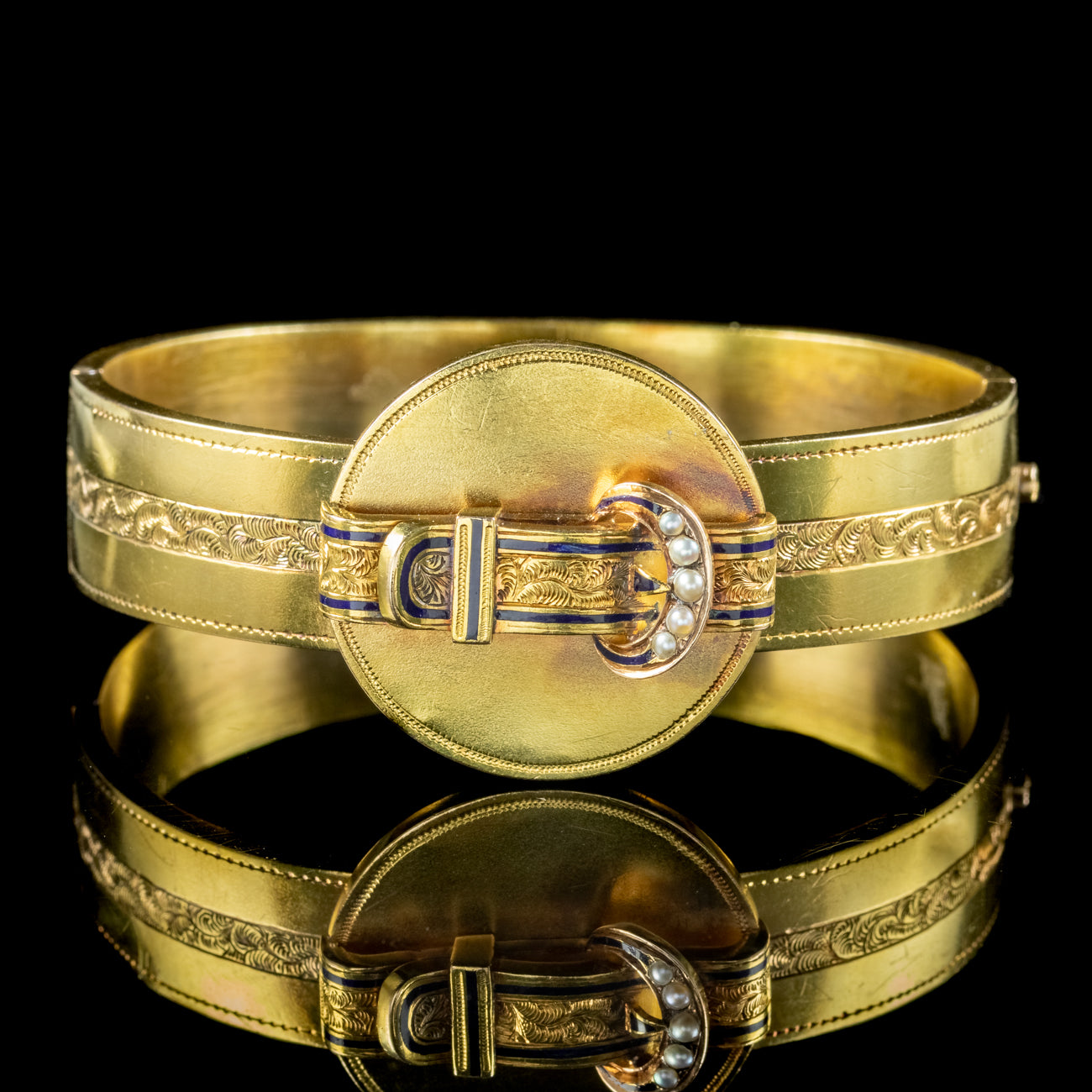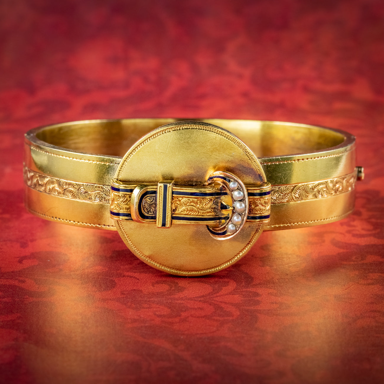 An exquisite antique Victorian bangle from the late 19th century depicting a belt with a buckle on the front, decorated with blue enamel stripes and five pearls.?