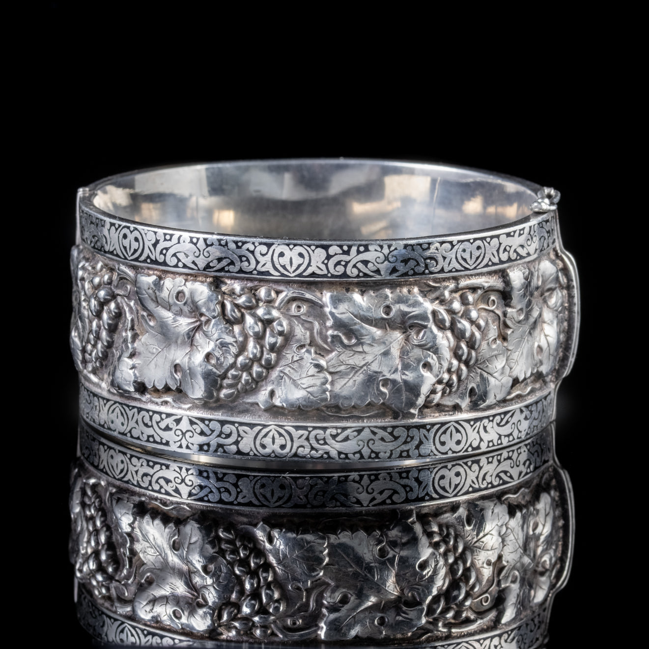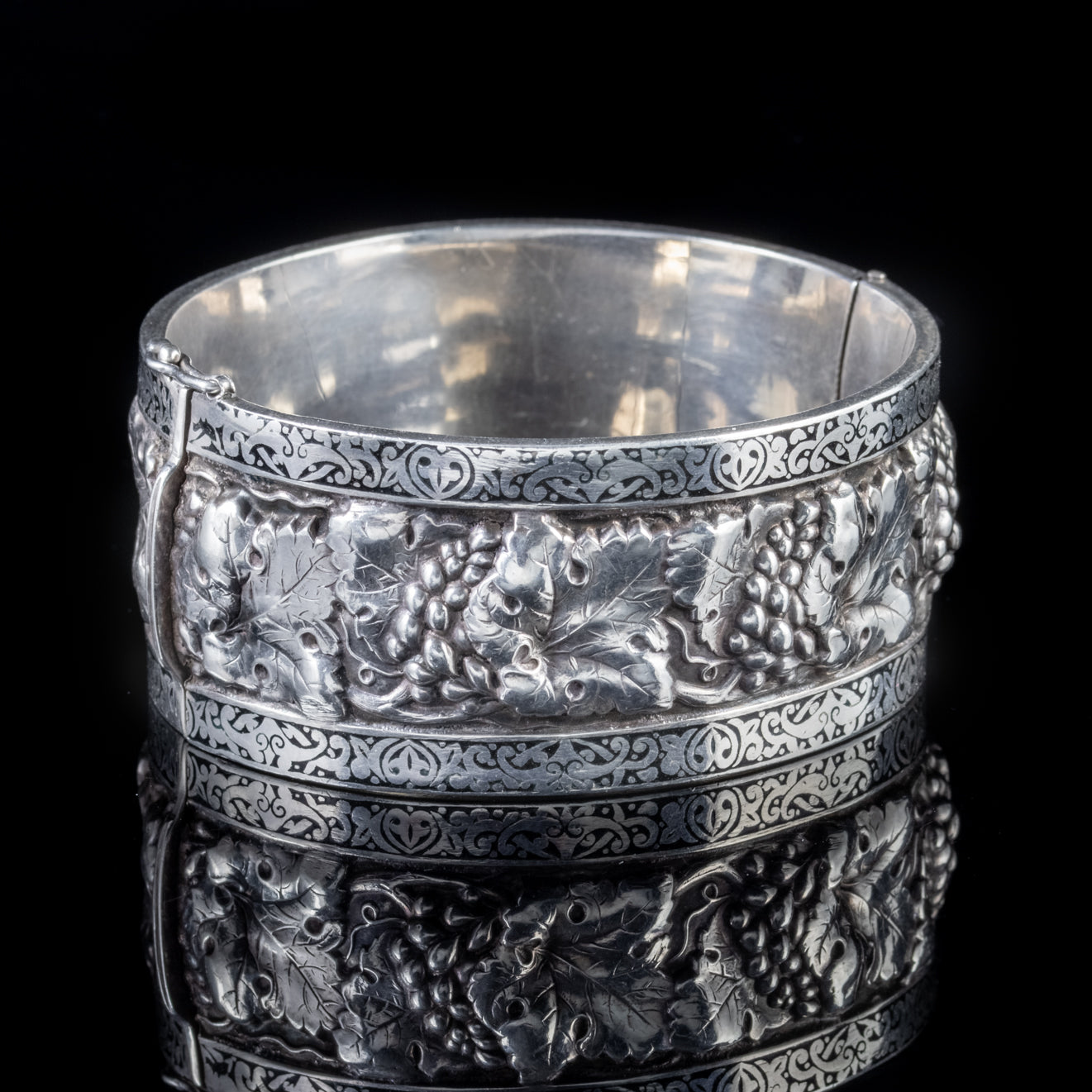 An exquisite antique Victorian cuff bangle modelled in strong Silver featuring high relief depictions of Grapevines wrapping and twisting around the entire circumference with superb detail across every leaf and grape.