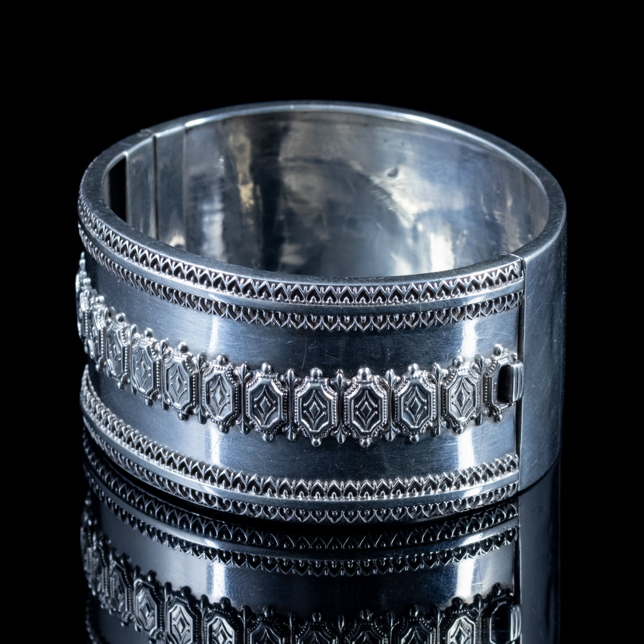 This magnificent antique Victorian cuff bangle has been beautifully crafted in sterling silver. It features ornate, high-relief patterning along the front with a large box clasp at the side.