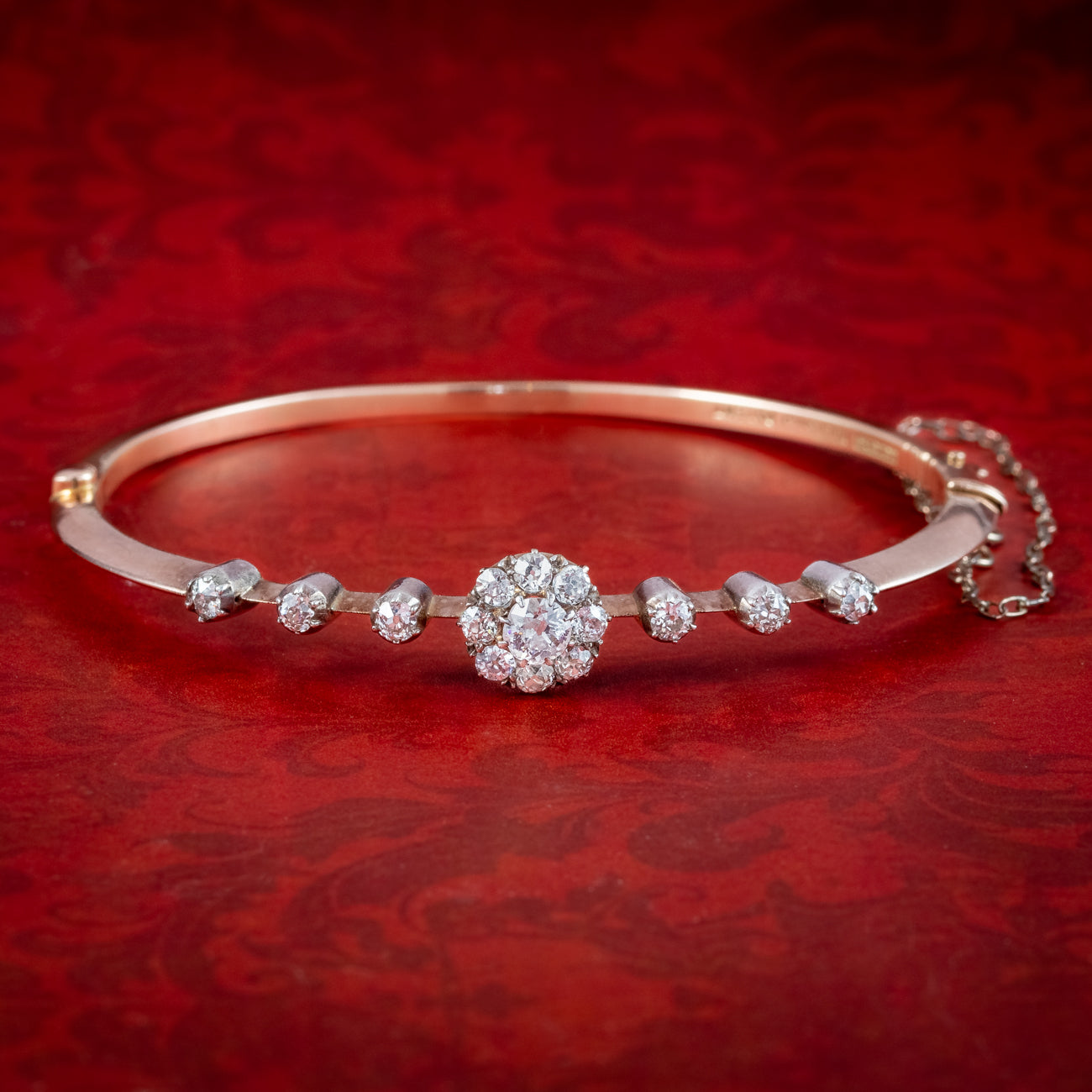 An elegant antique Victorian diamond bangle featuring a flower-shaped cluster of sparkling old mine-cut diamonds at the front, with three more chasing down at each side. All have excellent SI1 clarity ¨C H colour and the largest weighs 0.23ct in the centre, approx. 1ct total.?