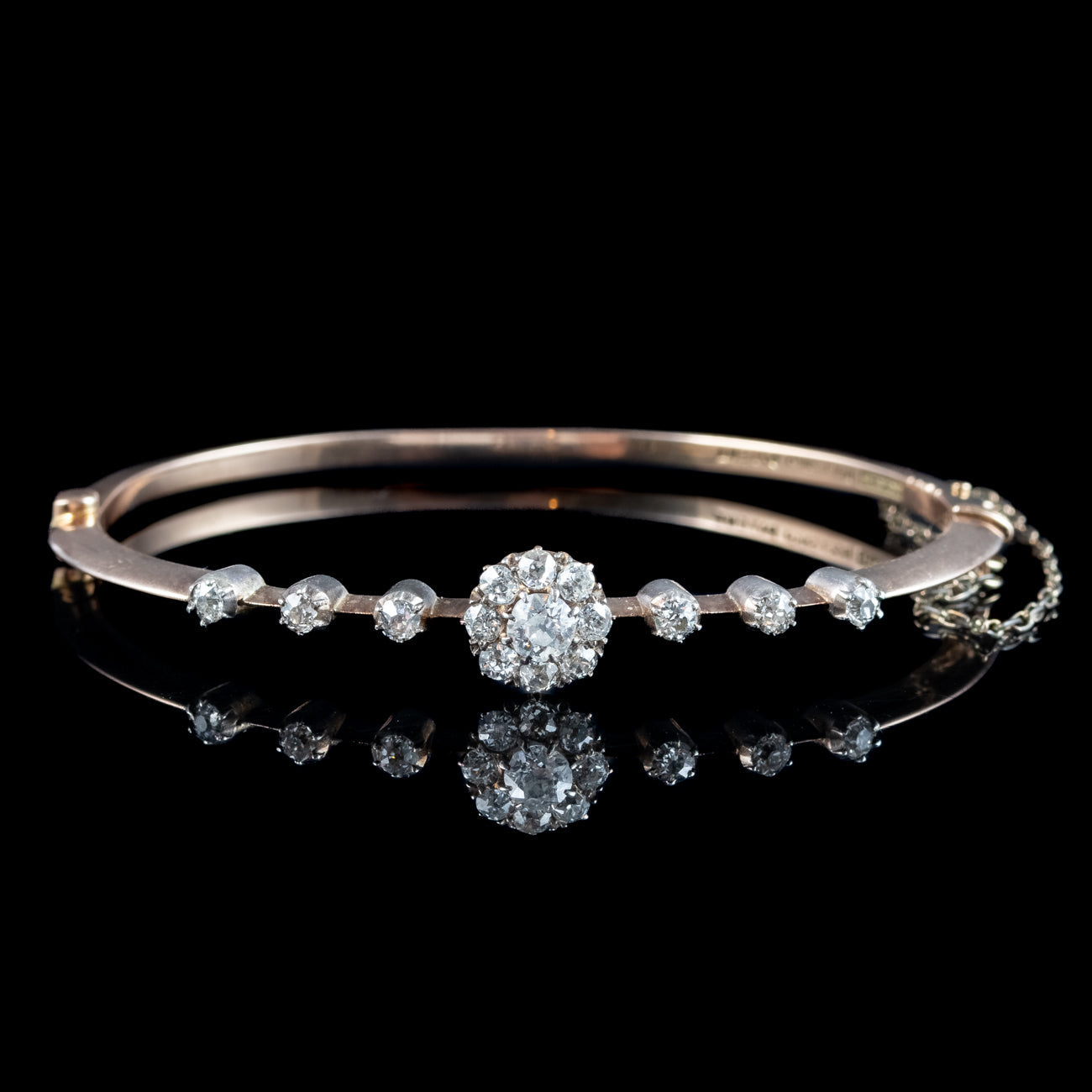 The sleek band is crafted in 18ct gold which has developed a rosy-bronze hue with age and is fitted with a bolt snap clasp at the side and a safety chain. It¡¯s a stunning antique bangle, dating to the late 19th Century with a pretty array of twinkling diamonds on show.? ?